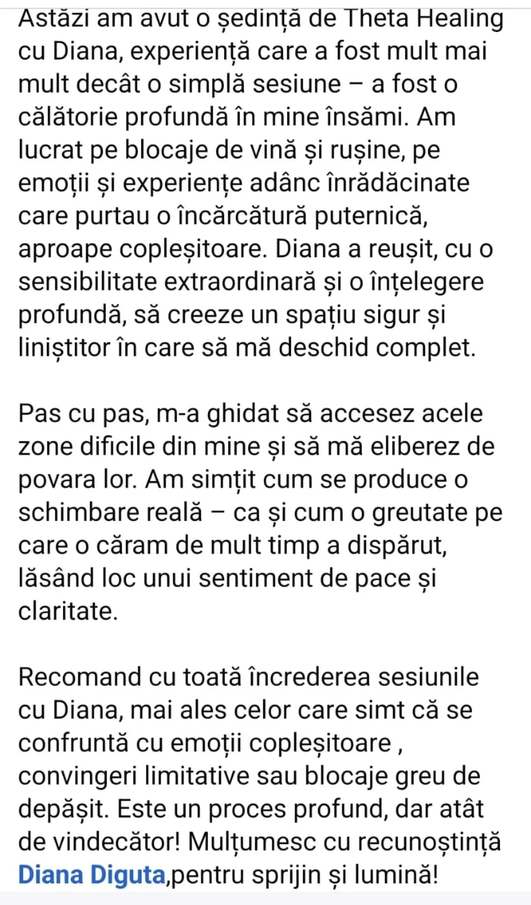 Când am descoperit tehnica Theta Healing, am început să lucrez cu subconștientul meu. Am descoperit blocaje și limitări de care nici nu eram conștientă. Fiecare eliberare m-a făcut să simt o liniște profundă, ca și cum un bagaj greu era lăsat jos.